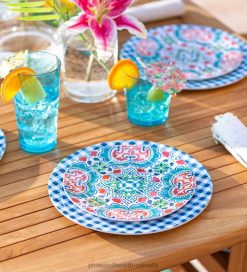 Crafted of a recyclable acrylic compound, they’re shatterproof and dishwasher safe. Cool colors resemble sea glass, making them a wonderful complement to your other tableware.