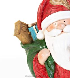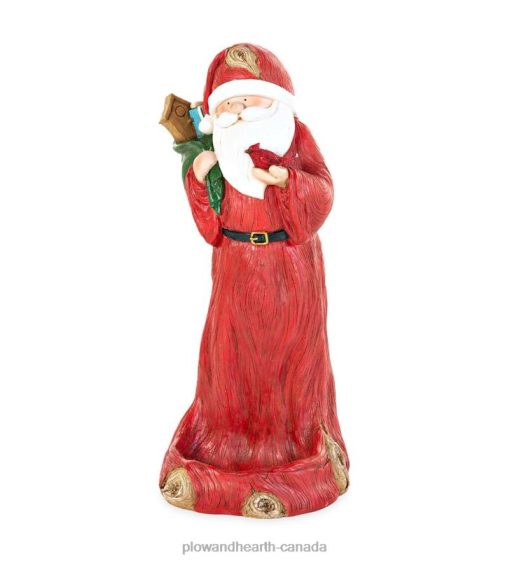 This Santa bird feeder statue has a beautiful carved appearance that looks like real wood and features many delightful details, including Santa holding a cardinal and a pack of gifts with carved wood knots spread throughout.