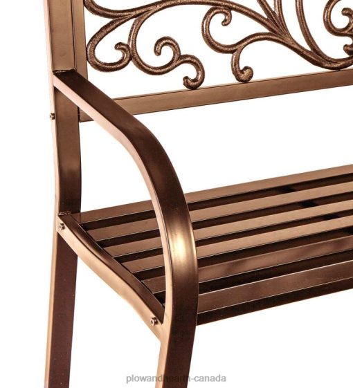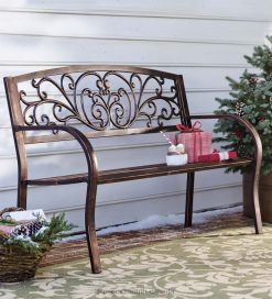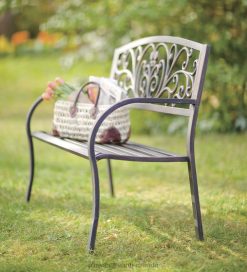 Our Blooming Garden Metal Bench is ideal for enjoying your favorite peaceful spot, along a path, under a tree or among the flowers.Sturdy, full-sized bench features a decorative back with scrollwork and vines. A deep bronze finish complements the design.Our Blooming Garden Metal Bench has a sturdy steel frame with cast iron back design panel. All-weather powder coat. Easy assembly.