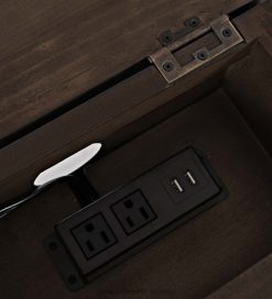 The back third of the top is hinged to reveal a power strip with two USB ports and storage for your electronic devices, keeping them out of sight while charging. Three roomy drawers hold TV remotes, reading material or other items to help you keep your living space clutter-free.
