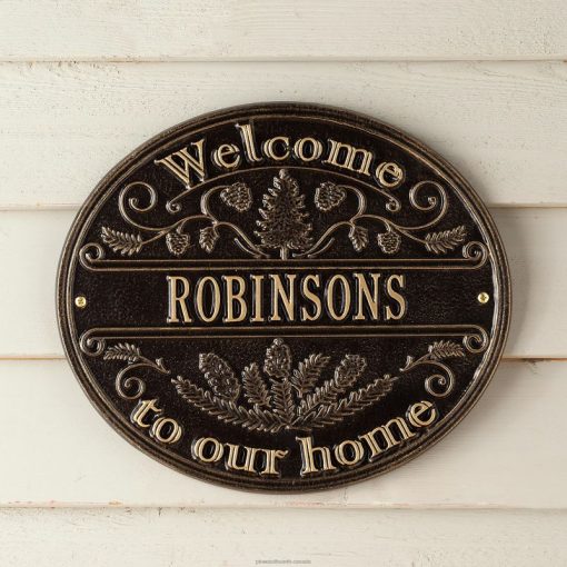 Our Pine Welcome Wall Plaque greets guests with a warm message when they enter your home. Made of recycled cast aluminum, this house plaque features contrast lettering and design to stand out. This Pine Welcome Plaque makes a thoughtful gift for wedding, housewarming or anniversary. Its attractive and long-lasting with a powder-coated finish to protect against the elements. Perfect for both indoor or outdoor hanging! Made in USA. Please note: Welcome and to our home are standard and cannot be altered.