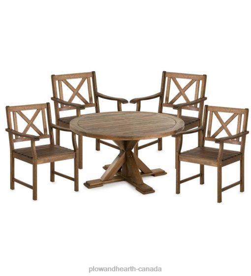 Our Claremont Eucalyptus Round Dining Table and Chairs elevates your outdoor entertaining space.Our round dining table and chairs are made of FSC-certified eucalyptus grandis, sustainable and sturdy with a bonus style quality. Eucalyptus furniture undergoes extensive finishing to give it a rich, handsome look. All hardware is galvanized steel – an appropriate accent to this rustic collection.The table seats 4-6, while the cross-back chairs are not only beautiful, but they also provide excellent support. Add cushions for ultimate comfort (sold separately).These outdoor dining pieces will become your yard or patio’s new focal point that will draw your guests right to it.