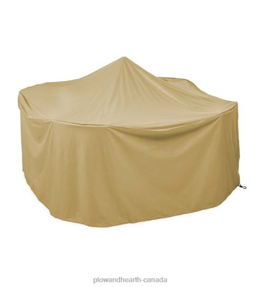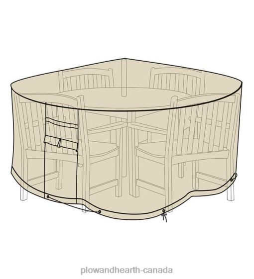 Our Deluxe Extra Large Round Table and Chairs Cover stands up to sun, wind, rain and extreme temperatures. Two layers of tough polyester fabric protect against moisture – rain runs right off.A metal center support rod keeps water and debris from accumulating during the off-season. Covered vents allow for air flow, helping to prevent mildew during storage.Our outdoor furniture cover has sturdy handles for easy on/off, and elastic toggle ties to keep it secure. The attractive sand color looks great and resists fading. Cover fits most round tables with 4-6 chairs.
