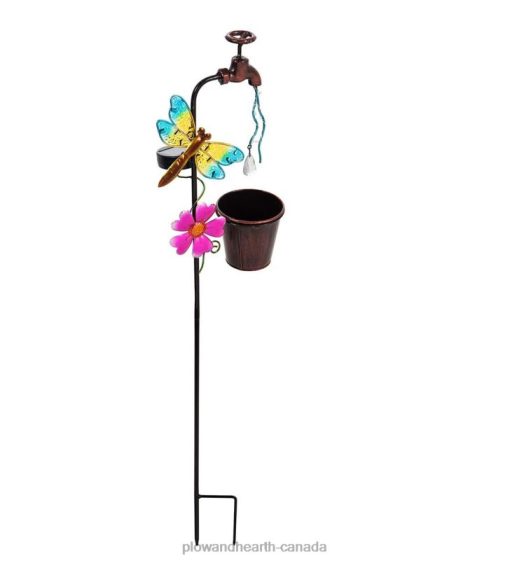 This stunning design depicts a vibrant dragonfly soaring over a pink flower near a faucet that looks like it is dripping water into a planter basket. The twinkling light effect from the dripping water makes this playful scene come to life at night.