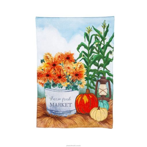 Bring a warm welcome to your yard with this detailed Farm Fresh Market Burlap Garden Flag. With textured pumpkins and a traditional farm scene, this flag will get you ready for harvest season and all it has to offer.