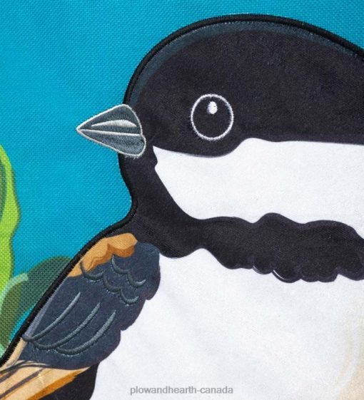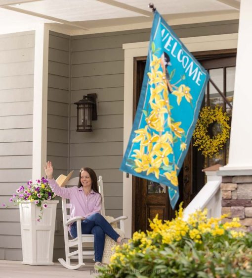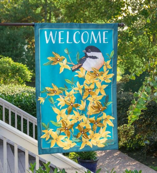 Vibrant yellow forsythia and chickadee really pop against a bright blue background with cheerful Welcome message. Use this large estate-sized flag to bring big character to your entryway for the season or any time of year.