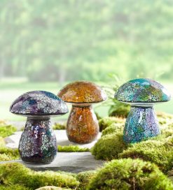 Sparkling sprouts make for a lavish garden! Beautifully crafted from glistening glass mosaic pieces, these mushrooms are gorgeous by day, but they really shine at night when lit.Decorate a flower bed, garden or walkway, lighting the way to your front door or to your backyard paradise. Auto on/off timer takes 2 AA batteries; not included. Display one or many for a magical glow.