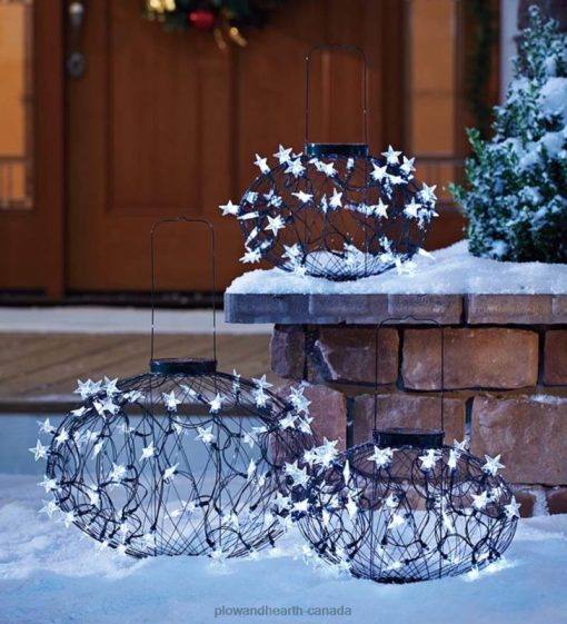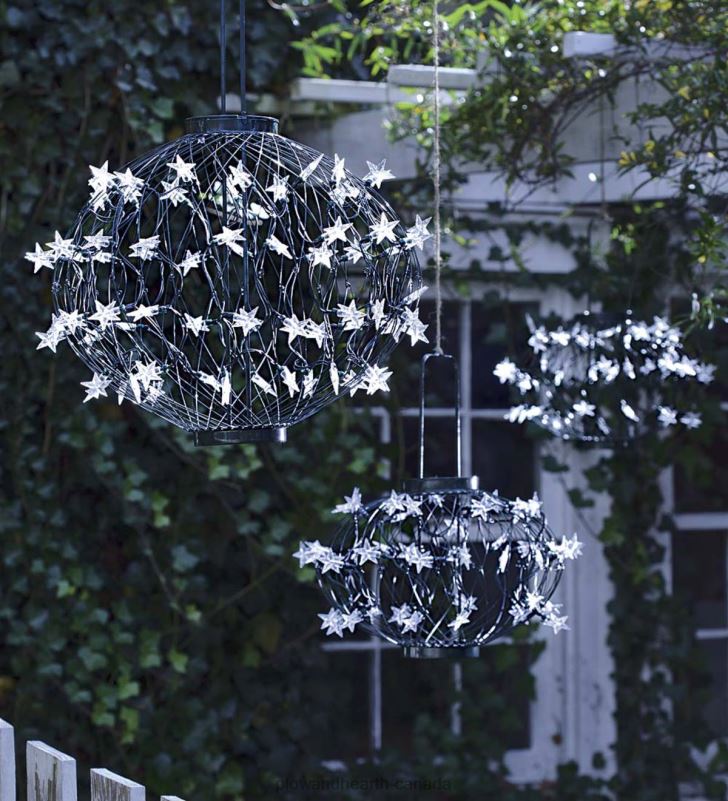 Now you can add a star-studded festival of lights to your outdoor spaces with our green Solar Star Lanterns with star-shaped LED lights. They’re a customer favorite in any season!You’ll love the instant charm and ease of use of our lighted Solar Lanterns. Just hang them in a tree in the sun (full sun is best) and the built-in solar panel catches rays that keep them lit after dusk.Each versatile outdoor lighted Solar Lanterns can be shaped as a ball or column. They look great hanging in multiples from a tree, placed on the ground, lining a walkway or highlighting any outdoor decor.The Small Solar Ball has 45 lights; Large Solar Ball has 72. The Set includes 2 small and 1 large Solar Lanterns. Light output and duration are dependent upon factors including weather conditions and placement. Place in direct sunlight for maximum display.We were so inspired by the yearly neighborhood Christmas Ball display in Greensboro, NC, that we decided to design our own easy-to-use, cord-free solar version that can be used and enjoyed any time of year.