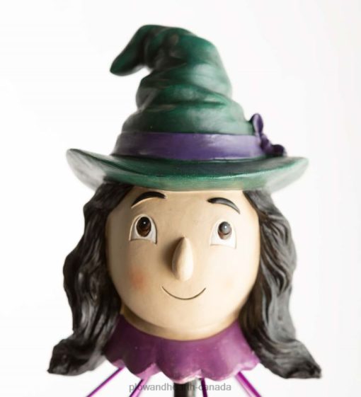 Let her kind smile greet guests, trick-or-treaters, and passers by alike. Everyone will love her green witch’s hat and purple bow!
