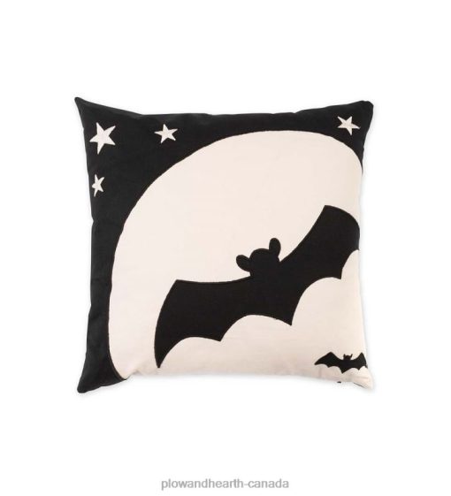 - Halloween pillow features bats silhouetted against a full moon with embroidered stars