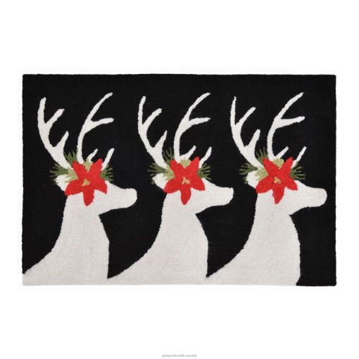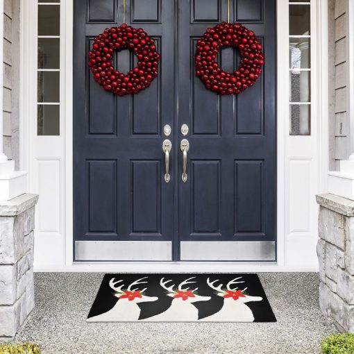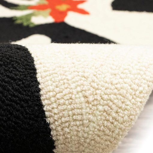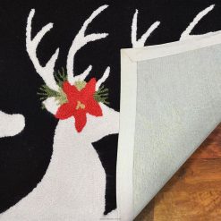 Complete your holiday decorating with this Hand-Hooked Poinsettia Reindeer Rug. The striking black and white silhouettes of the reindeer give the poinsettia accents a pop, making this rug the perfect addition to any space.