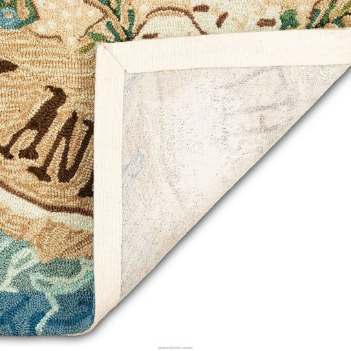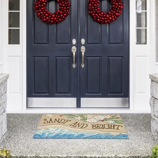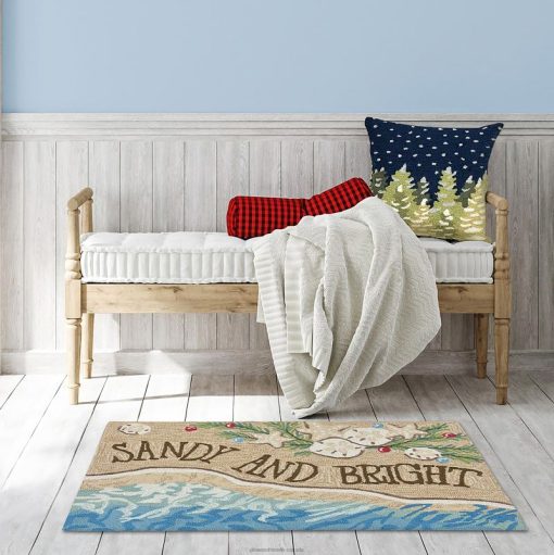 Complete your holiday decorating with this Hand-Hooked Sandy and Bright Rug. This rug features a beach with a mix of pine boughs and shells with the words Sandy and Bright etched into the shore, perfect for adding a seasonal flair to coastal decor.