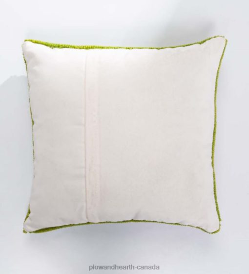 The pillow features an incredibly detailed butterfly lighting on a cluster of pink flowers. It’s a party of colors, from pink to orange and black, standing out from a grass green background. The design comes to life thanks to the detailed hooked pillow face with variations in color and a wonderful texture.