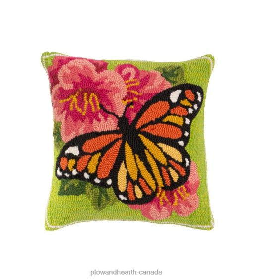- Hand-hooked polypropylene pillow with monarch butterfly lighting on flowers