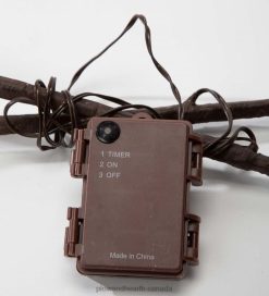 The LED lights are battery-operated on a timer for 6 hours on, 18 hours off. 18 lead wire from the battery pack. Takes 3 AA batteries, not included. Use indoors or outside. Imported.