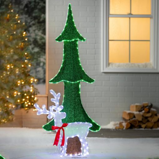 Plug this piece into any outlet and watch the design come to life as a charming, little deer poses with this pine tree. Vibrant LEDs light up the edges of this design, perfect for adding that extra touch to your porch, yard or even an indoor display. This design stands at nearly 5 feet tall for a brilliant sight.