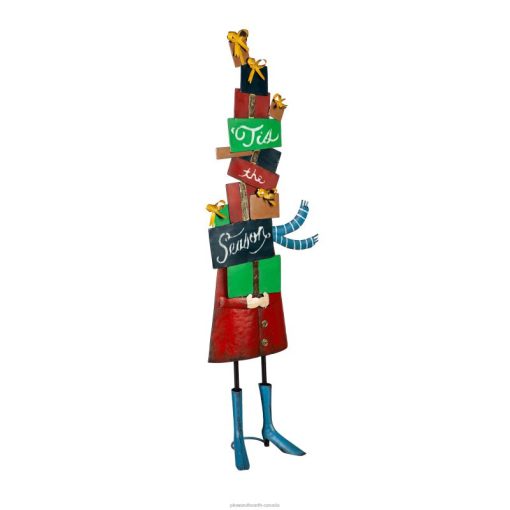 This statue is packed with vibrant color from the delightful boots to smallest present teetering at the top. The laser-cut metal pieces have been artfully attached together to give this design a gorgeous look with hand-brushed color and gold lief on the buttons. The presents read ‘Tis the Season for the perfect holiday greeting.