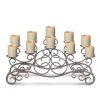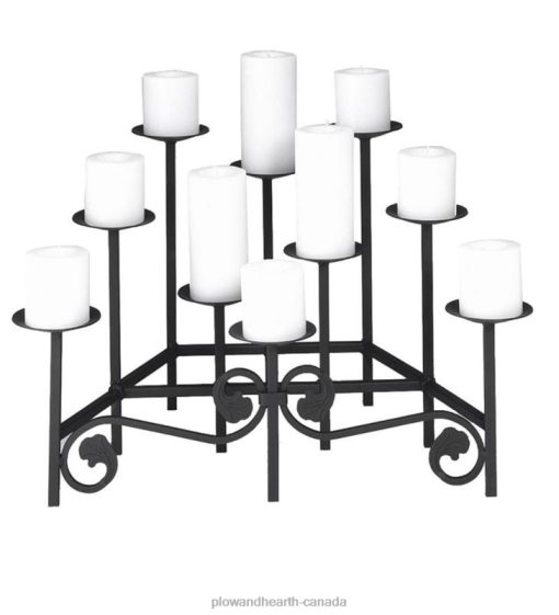 Now you can enjoy a warm glow in your fireplace without having to chop wood or sweep up ashes. OurIron Fireplace Candelabra with Ten Tiers provides dancing flames without the heat so you can enjoy your fireplace all year. Leaf-tipped scroll design in the base adds elegance to the sturdy iron frame. Black finish. Holds ten pillar candles (not included).