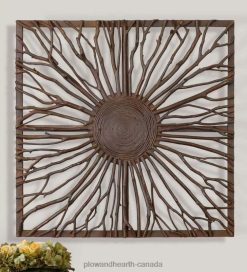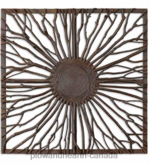 - This decorative wall art features real wooden branches with burnished edges and light gray accents woven onto a wooden frame.