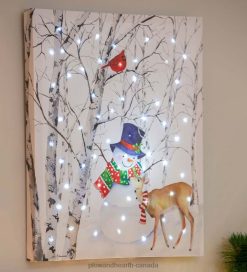 The picture of a winter wonderland, our LED Joyful Snowman Wall Art features original artwork by artist Barb Tourtillotte on a printed canvas.