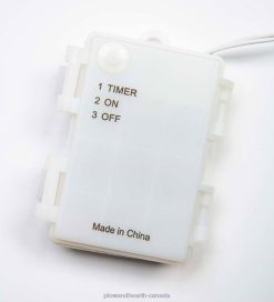 Battery-operated with on/off/auto-timer. Timer stays on for 6 hours, off for 18. 16’L cord. Takes 3 AA batteries, not included. Imported.