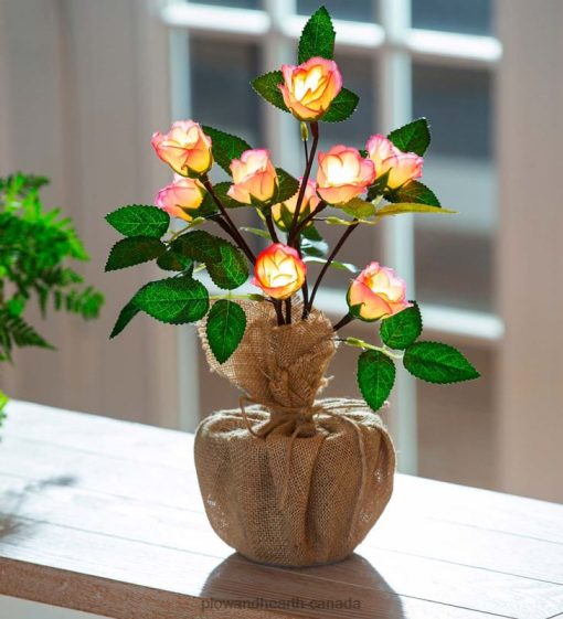 - Roses sit in a burlap pot and glow with the flip of a switch