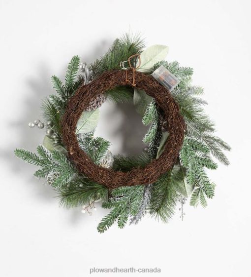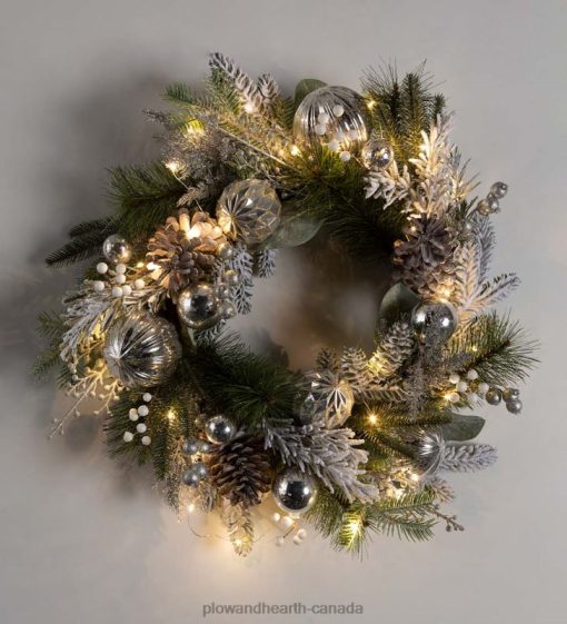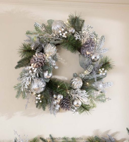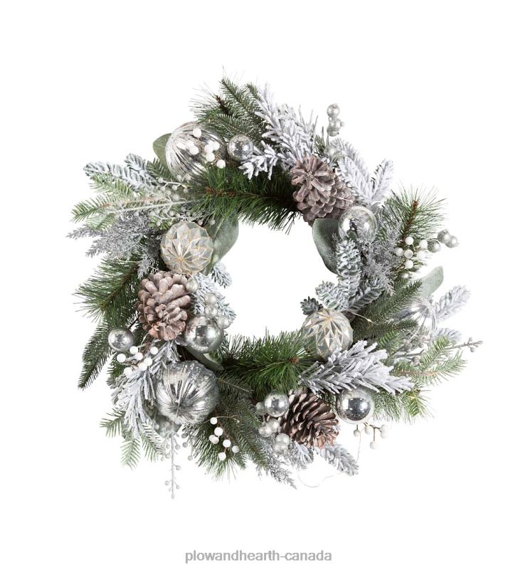 Add sparkle to your home for the holiday with this shimmery Lighted Silver Evergreen Holiday Wreath. It features frosted pine needles, winter foliage, silver-toned pinecones and lots of ornaments that twinkle and glisten in warm white light.