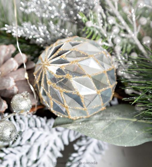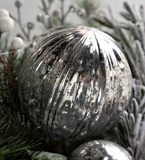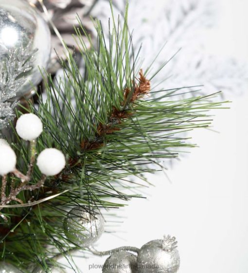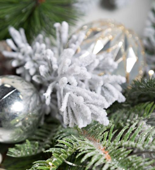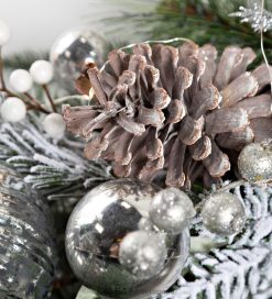 - Features frosted pine needles, winter foliage, silver-toned pinecones and lots of ornaments