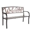 Features sturdy steel frame; cast iron back design panel. Rounded arms add to the timeless appeal. Includes all-weather powder-coat finish. Easy assembly