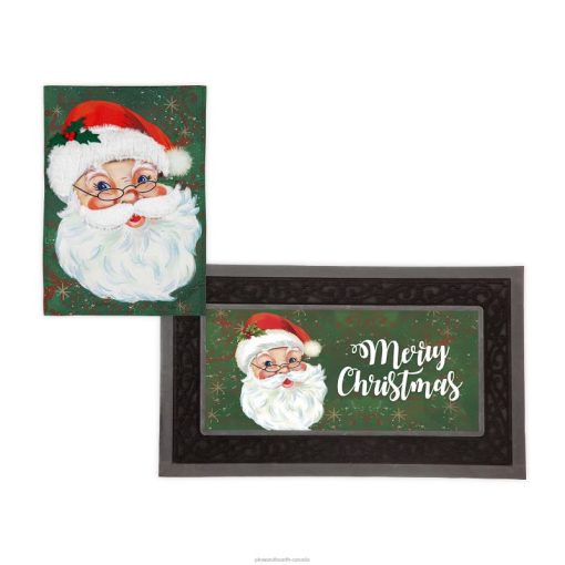The perfect set for coordinating decorators! The Merry Santa Garden Flag and Sassafras Mat Bundle Set includes a sassafras switch mat with base and a matching garden flag. Flag and mat feature a jolly Santa in vibrant holiday hues; text Merry Christmas on the mat.