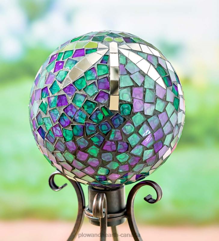 Shimmering shards of vibrant green and purple glass create a mosaic pattern with a dragonfly that makes a striking statement in any outdoor space. The gazing ball measures approx. 10 and is crafted of weather-resistant glass and cement that ensures it is safe for outdoor use.