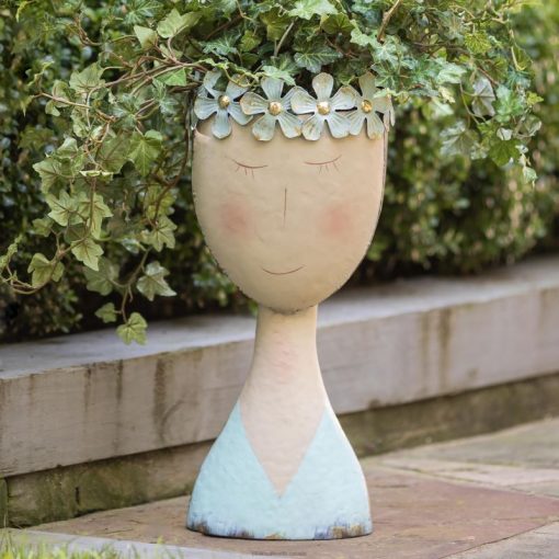 Gorgeous, detailed and unique – this planter is sure to add some fun to your porch, patio or garden. Planter is charming and has a hand-brushed look with gold lief detailing on the shirt and crown of flowers. The face has delicate details with sweet lashes and rosy cheeks.