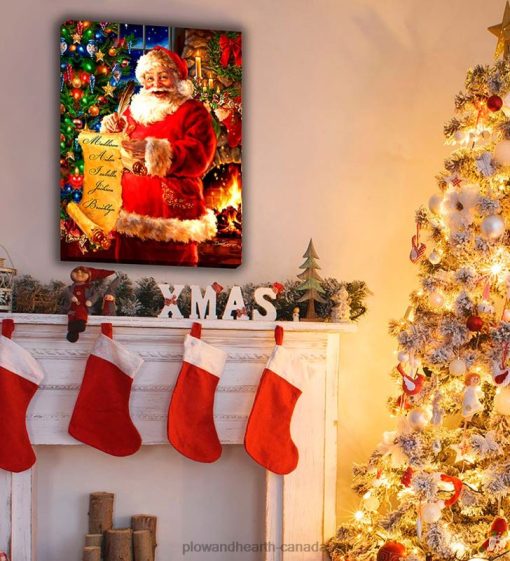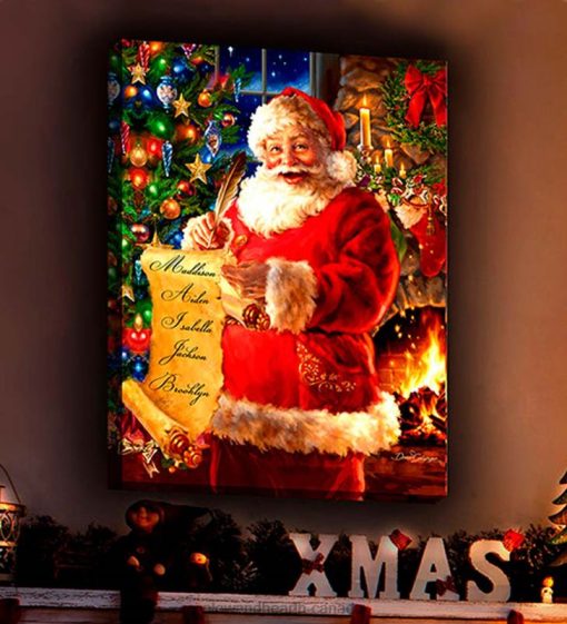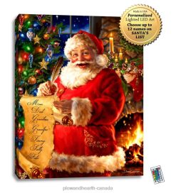 The beautiful canvas painting features Santa Claus making his list which can be personalized with the names of your very own loved ones. Christmas tree, candles, stockings and a roaring fire at the hearth complete this heart-warming picture.