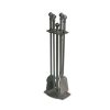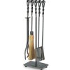 Tools feature traditional shepherd’s crook handles, wood texture on shafts that offer good looks and improved grip. Hefty semicircular steel stand holds four fireplace tools. Matte black powder coat finish.