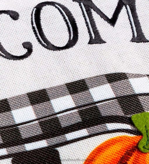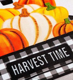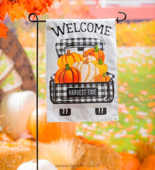 - Garden flag welcomes friends, family and passersby with a vintage buffalo check pickup packed with pumpkins!