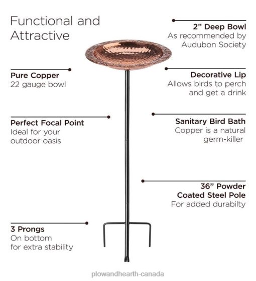 The sturdy steel pole has three metal prongs for secure installation in the ground. The copper basin is 2 deep, as recommended by the Audubon Society, and the decorative edge doubles as a retreat for feathered-friends to rest between drinks.