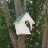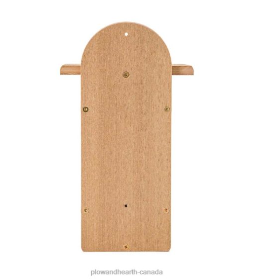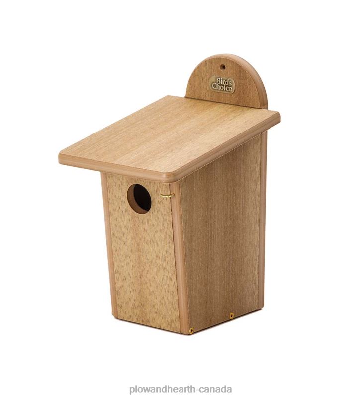 This handsome bluebird house has 1 1/2 entrance hole as recommended for Eastern bluebirds. Grooves in front door make it easy for baby birds to climb in and out of the house. Front door panel opens for easy cleaning. Easy to mount on post, pole or tree.