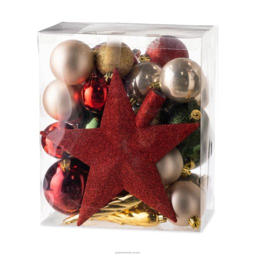 Set of 33 ornaments includes coordinating red and green ornaments in a variety of shapes and sizes, including small, medium and large baubles, icicles and a tree topper. All ornaments have a mix of shiny and metallic finishes to beautifully accent your tree. Gold/silver wire hangers included.