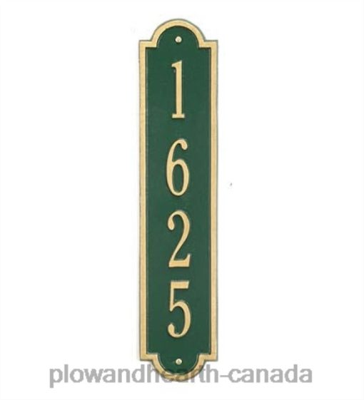 Custom-made in the USA from recycled cast aluminum, our Richmond Vertical Wall Plaque features raised gold-hued lettering on your choice of background color. Powder-coat finish protects it from the elements. Accommodates up to seven vertical characters, spaces or numbers. Available Colors Antique Copper Bronze Black Green Size 4 x 19 H Personalization Specify up to five 3 H characters or seven 1-3/4 H characters Shipping Allow 3-4 weeks for delivery.