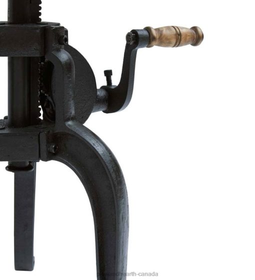 Using the side crank, the height adjusts from 18 H to 24 H. With rustic style, the table features a natural wood top and handle on the cast iron base.