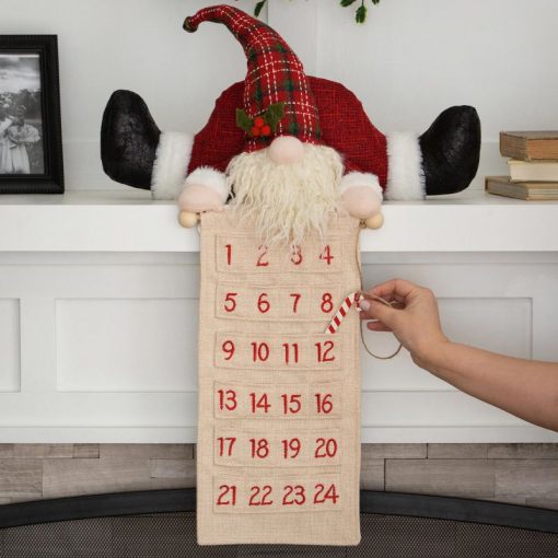 Crafted of fabric with a weighted base, Santa’s back half sits on any shelf, mantel or ledge while the calendar hangs down from his hands. Move the candy cane across days and count down until Christmas.