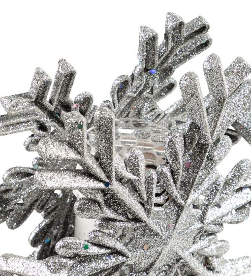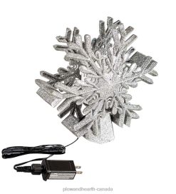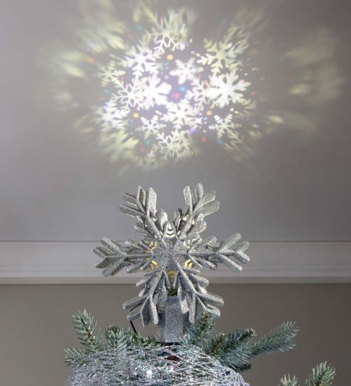 Give your holiday tree some extra sparkle with this LED Silver Glitter Snowflake Tree Topper. This tree topper features a three-dimensional snowflake design and comes in a silver glitter finish that projects snowflake icons onto the ceiling.