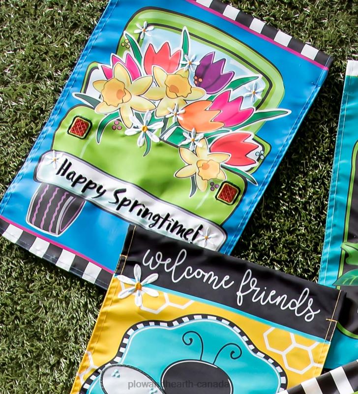 Usher in the season with unique style and flair with this Springtime Truck Applique Garden Flag and its vibrant truck-load of flowers! The Happy Springtime message and embroidered details add to this cheerful design.