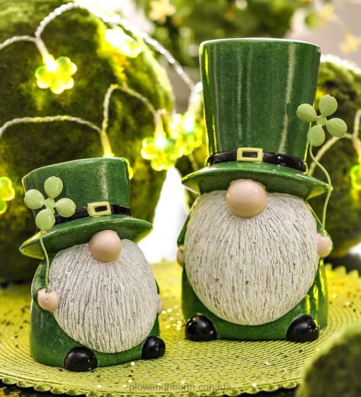 These St. Patrick’s Day Gnomes are perfect table top accents for St. Patrick’s Day. The gnomes are clad in their Blarney best! They have traded their gnome hats for charming green top hats and their shamrocks let you know they are ready for fun!