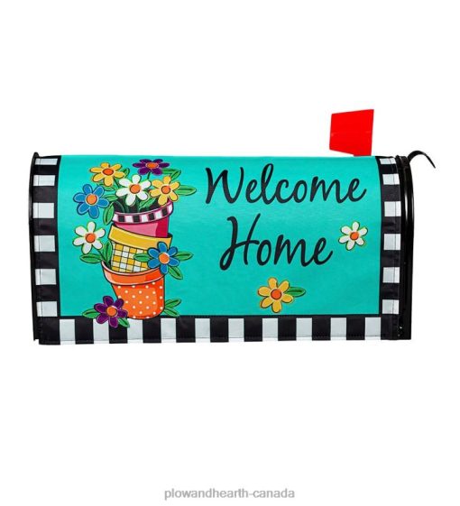 Refresh your home for the season with this Stacked Spring Flower Mailbox Cover! Guests will be greeted with this bright and cheerful design featuring a colorful pots of flowers on a teal background with checkered border. The black script reads Welcome Home to let everyone know that they are welcome at your house.