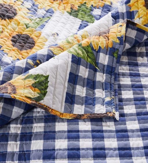 Bright, golden sunflowers and bumblebees are set against a classic blue gingham pattern. This design will add cheer and style to any room. Quilted with fabric bound edges for texture and durability. The quilt is reversed by a coordinating gingham, giving you two looks in one!