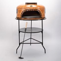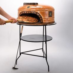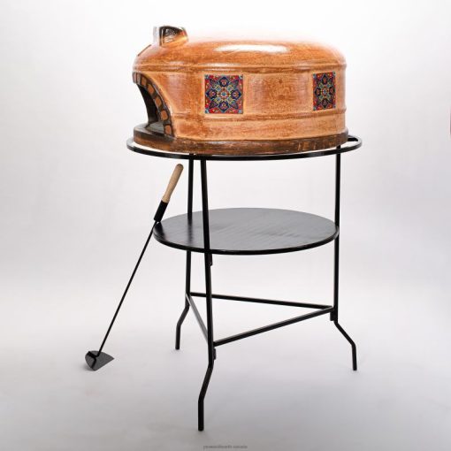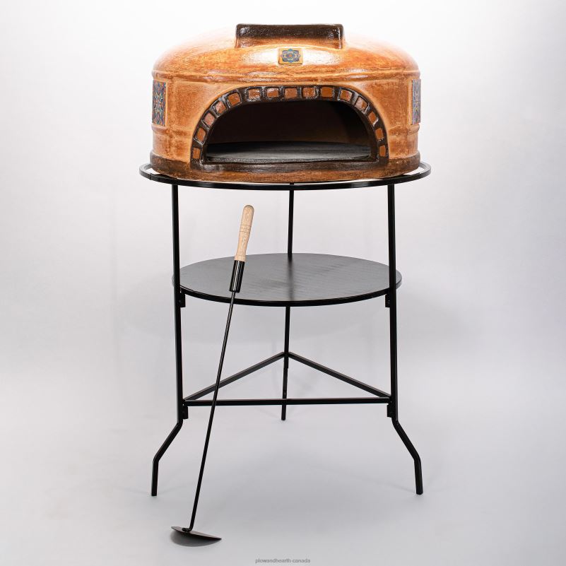 Pizza oven comes with a tiered metal stand, 2 clay pizza stones and a metal ember rake. For outdoor use only with wood, not for use with charcoal or chemical fire starters.