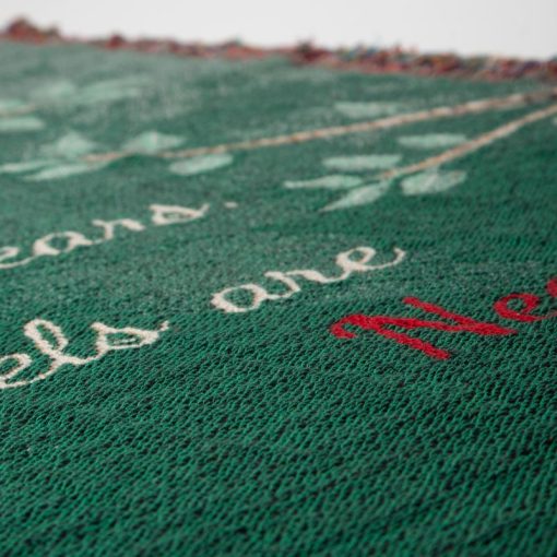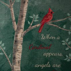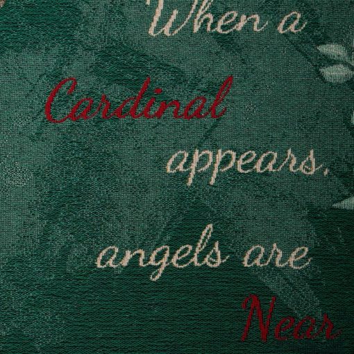 A crimson cardinal perches on a tree branch against a forest green background. Embroidered below is the message When a cardinal appears, angels are near. Cardinals have long been viewed as messengers from heaven, and this thoughtful blanket will warm your heart, body and soul.
