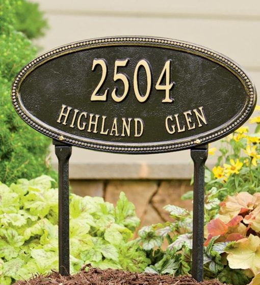 Display your address with our high-quality aluminum lawn or wall plaque. Custom-made in the USA from recycled cast aluminum, these plaques feature raised metallic-hued lettering on a background color of your choice. Powder-coat finish protects them from the elements. Lawn plaque comes with all-aluminum 18 stakes and wall plaque comes with mounting hardware.