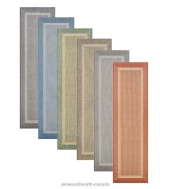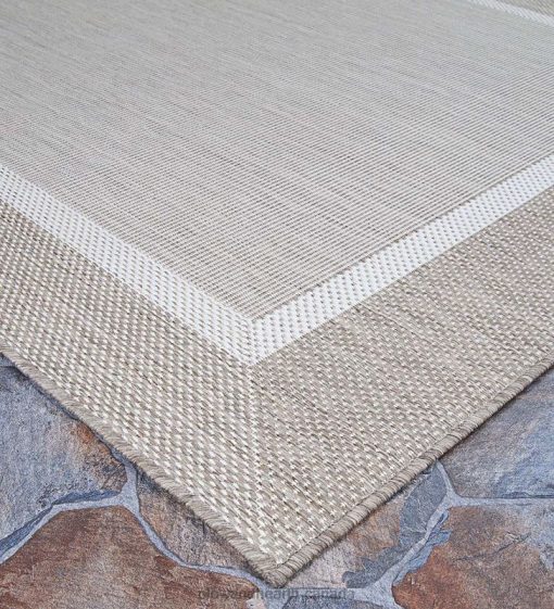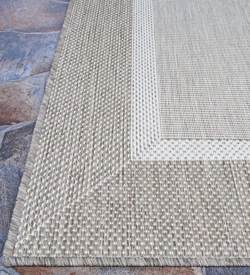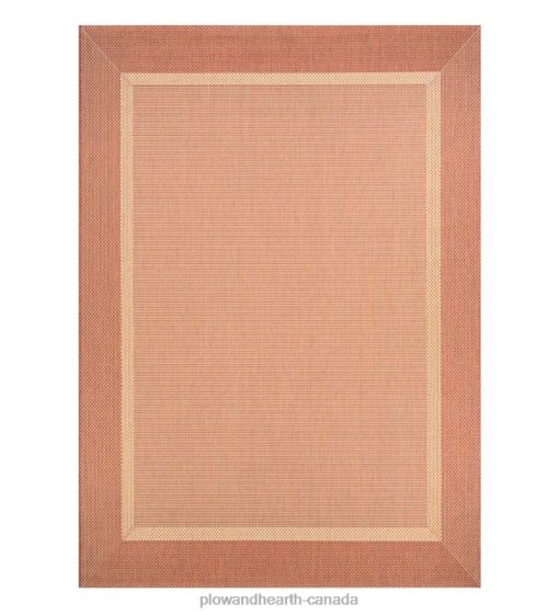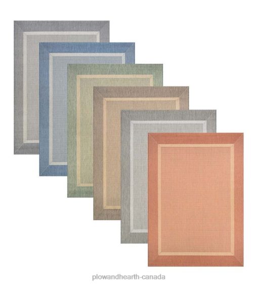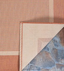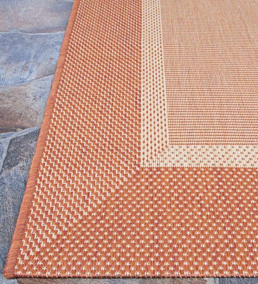 Our all-weather Veranda Framework Rug features a simple design and a unique color palette that adds warmth and welcome to patio decks, stone entryways and even indoor spaces. The Framework name echoes the mitered corner design of the border, resembling a picture frame.